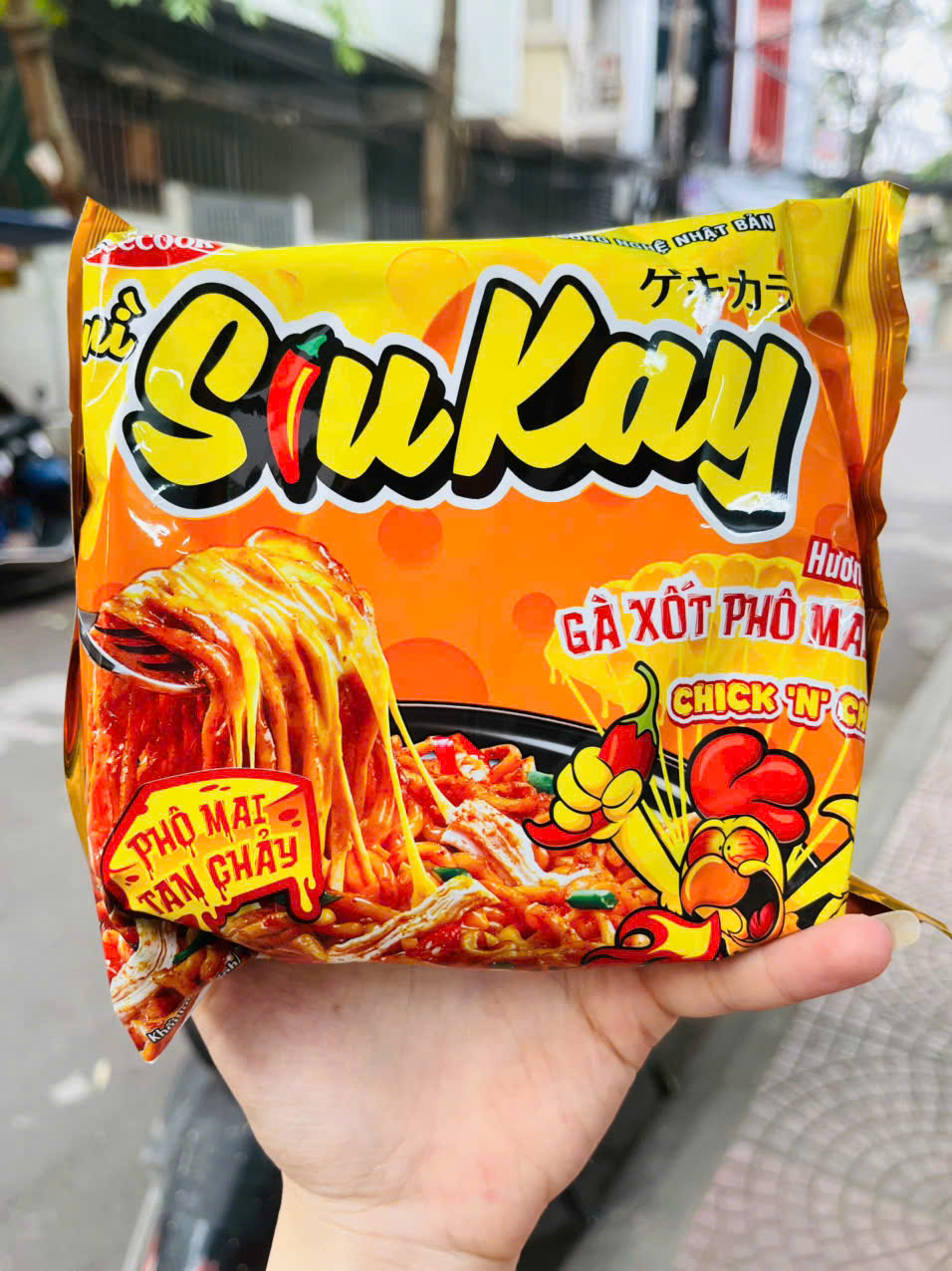 CÁC GÓI GIA VỊ – Đường, dầu thực vật (dầu cọ, chất chống oxy hóa (BHA(320), BHT (321))), ớt, cà chua, chất điều vị (mononatri glutamat (621), dinatri 5′-inosinat (631), dinatri 5′-guanylat (627), tỏi, bột phô mai 18,81 g/kg (sữa, lúa mì), muối, các gia vị, thịt gà 6,02 g/kg, hương gà tổng hợp 2,12 g/kg, chất tạo màu tự nhiên (paprika oleoresin (160c)), protein đậu nành, chất tạo màu tổng hợp (caramen nhóm I (150a)), chất chống đông vón (dioxyd silic vô định hình (551)), chiết xuất từ ớt, hương hành phi tổng hợp, chất bảo quản (kali sorbat 202). |